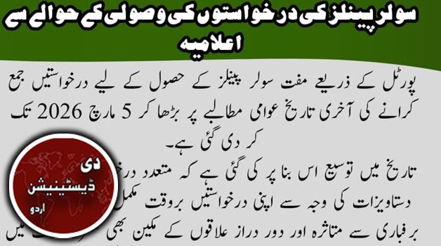 درخواستوں کی وصولی کے حوالے سے اعلامیہ جاری کیا گیا ہے جس کے مطابق پورٹل کے ذریعے مفت سولر پینلز کے حصول کے لیے درخواستیں جمع کرانے کی آخری تاریخ عوامی مطالبے پر بڑھا کر 5 مارچ 2026 کر دی گئی ہے۔