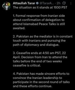 انہوں نے کہا کہ دو ہفتوں پر مشتمل جنگ بندی 22 اپریل کو صبح 4 بج کر 50 منٹ پر ختم ہو رہی ہے، جس سے قبل ایران کا مذاکرات میں شرکت کا فیصلہ انتہائی اہمیت رکھتا ہے۔ وزیر اطلاعات کے مطابق پاکستان نے ایرانی قیادت کو مذاکرات کے دوسرے مرحلے میں شرکت پر آمادہ کرنے کے لیے سنجیدہ کوششیں کی ہیں اور یہ عمل تاحال جاری ہے۔